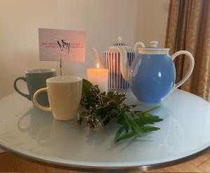 Je oog valt op een bloem of een steen of een fotootje dat je er graag bij hebt. Misschien heb je wat chocolade. Ook dat gaat op het dienblad. Het water heeft gekookt en je giet de thee op. De geur en warme damp zweven naar je gezicht, je voelt en ruikt de thee terwijl je naar je plekje loopt.