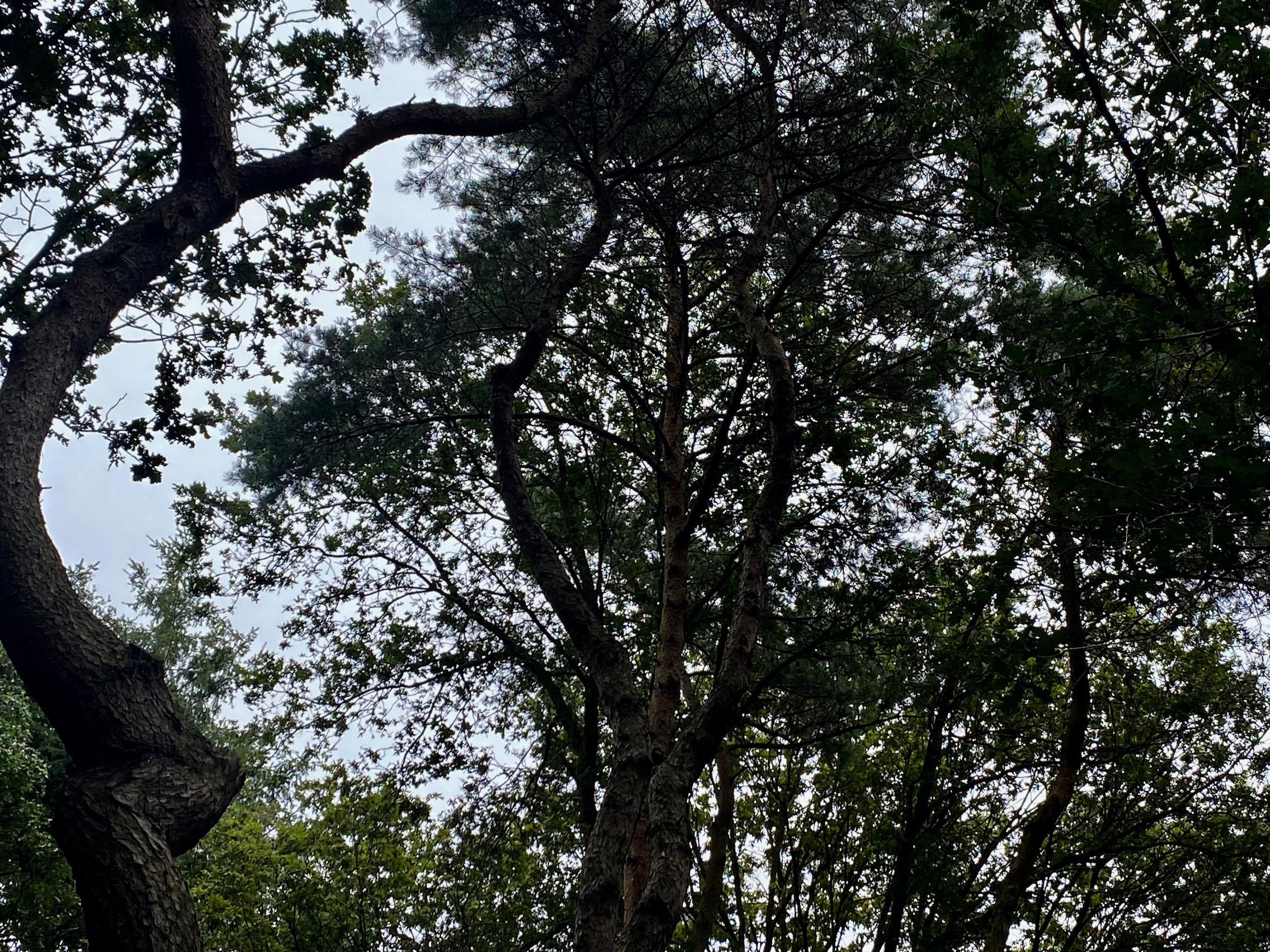 Zodra ik de poort uit ben komt er een traagheid over me heen, al zou ik sneller willen: het lijf wil niet mee. Het is een met plezier aanvaarde uitnodiging tot aanwezigheid. De route langs de straat naar het bospad wordt steeds boomrijker, in een afwisseling van grove-den en eiken. Zo sluit zich langzaam maar zeker het zicht op de hemel tussen de takken door en loop ik in een tunnel van groen. Tussen de stammen door kijk ik naar zon-beschenen velden, terwijl schaduw mij koestert.